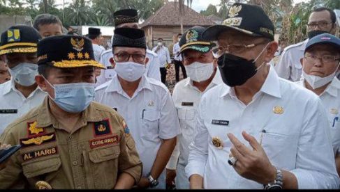 SAROLANGUN – Bupati Sarolangun Cek Endra saat mendampingi kunjungan Gubernur Jambi ke Desa Tendah Kecamatan Cermin Nan Gedang. memberikan bantuan kepada korban kebakaran kemarin. (02/12/2021).