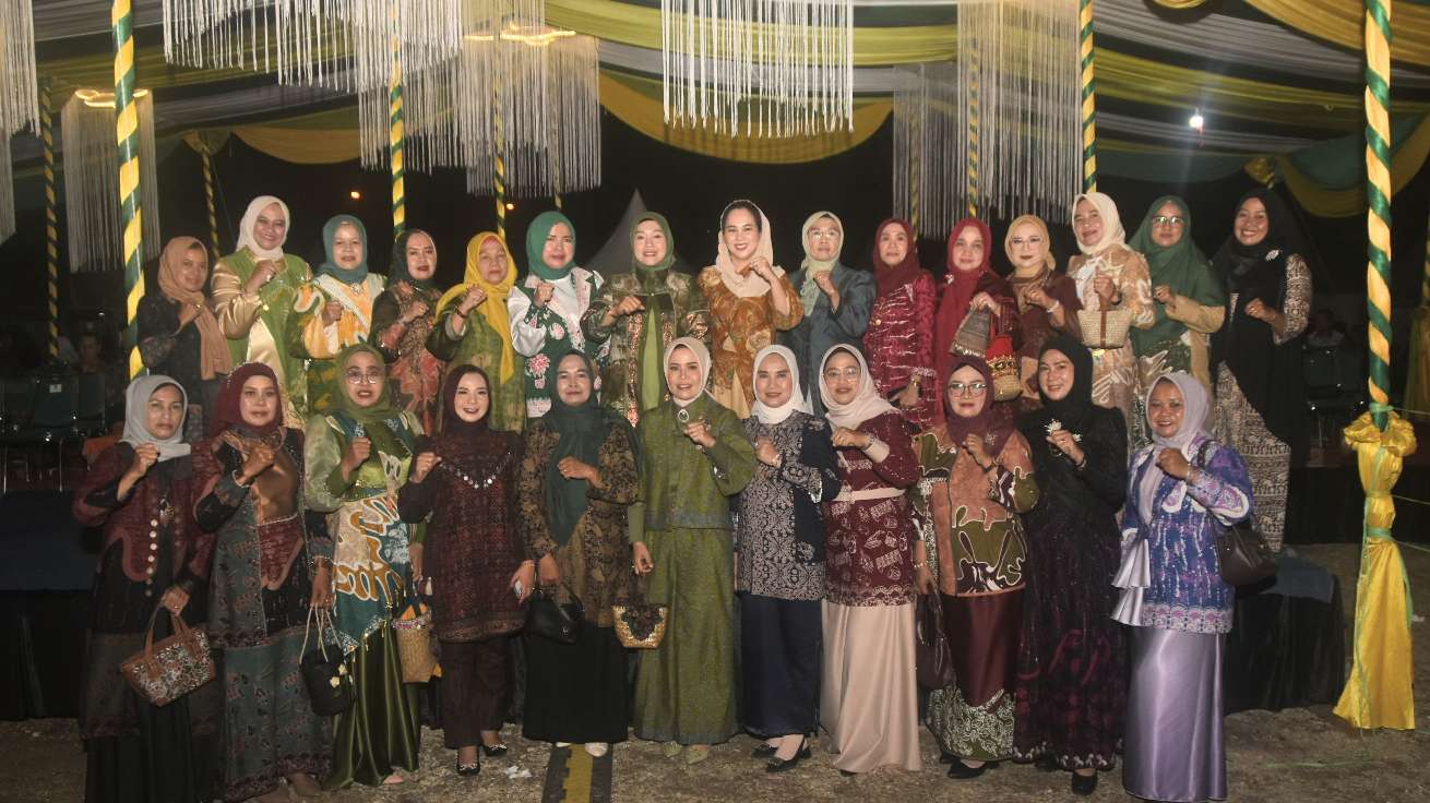 Ketua Dekranasda Sarolangun Hj Risha Fitria Hurmin, beserta ibu Ny Ratna Shafira Nafitri Rolan dan para istri pejabat Poto bersama dalam mempromosikan batik khas Sarolangun menuju Sarolangun maju