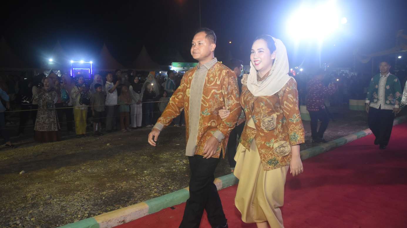 Bupati Sarolangun Hurmin bersama Ibu Hj Risha Fitria saat menyapa masyarakat Sarolangun dalam parade batik khas Sarolangun
