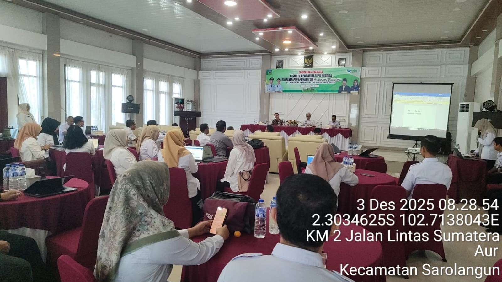 KABAR SAROLANGUN – Pemerintah Kabupaten Sarolangun melalui Badan Kepegawaian dan Pengembangan Sumber Daya Manusia (BKPSDM) melaksanakan kegiatan pembinaan Disiplin bagi Aparatur Sipil Negara (ASN) Dan penerapan aplikasi Integrated Discipline (IDI’S) Versi 3.0, Rabu (03/12/2025) di Ballroom Hotel Nafiri Sarolangun.