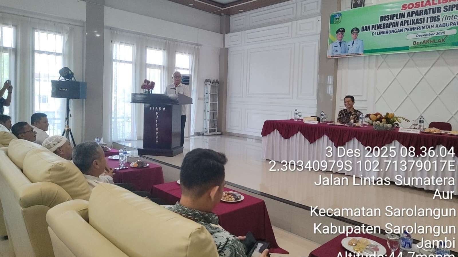Dalam kesempatan itu, Asisten III Sarolangun Hazrian mengatakan atas nama Pemerintah Kabupaten Sarolangun mengucapkan terima kasih kepada narasumber yang telah hadir semoga dapat memotivasi semangat bagi para ASN serta memberikan pencerahan dan masukan dalam pembinaan disiplin ASN sekaligus penerapan aplikasi discipline integrated Versi 3.0.