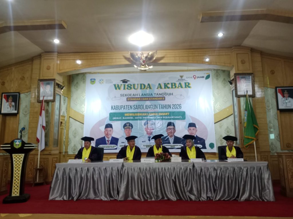 SAROLANGUN – Bupati Sarolangun H. Hurmin hadiri kegiatan Wisuda Akbar Sekolah Lansia Tangguh Kabupaten Sarolangun Standar I dan Standar II dalam mewujudkan lansia smart (Sehat, Mandiri, Aktif, Produktif dan Bermartabat).