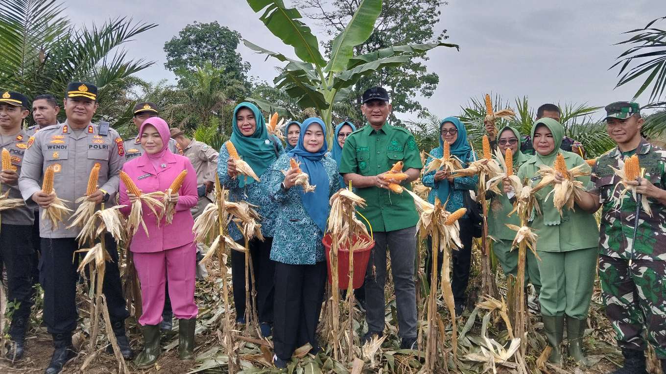 Bupati Sarolangun Hurmin beserta ibu Ny Hj Risha Fitria, Kapolres AKBP Wendi Oktariansyah beserta ibu, Dandim Letkol Inf Yakhya Wisnu Arianto beserta ibu dan jajaran saat panen perdana jagung