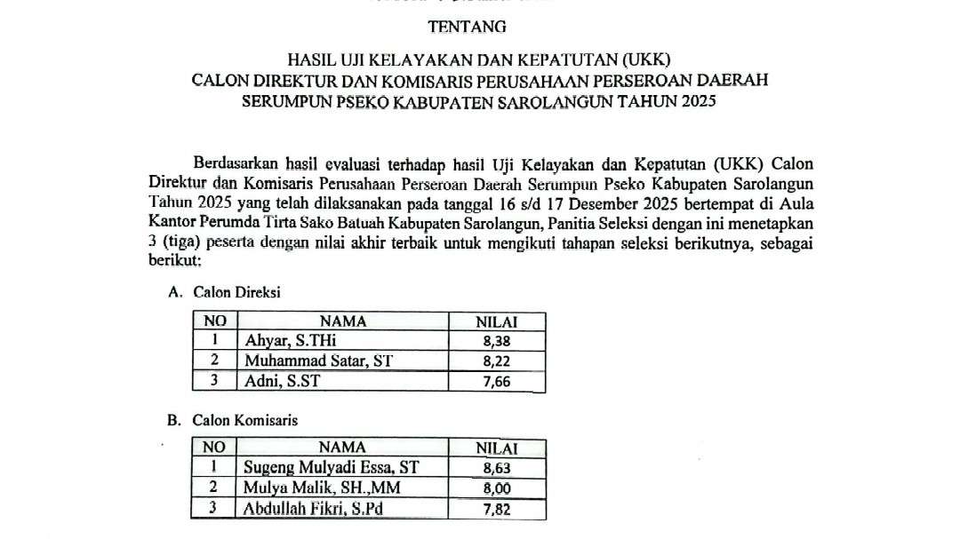 KABAR SAROLANGUN – Panitia Seleksi Calon Direktur dan Calon Komisaris Perusahaan Perseroan Daerah (Perseroda) Serumpun Pseko Tahun 2025 mengumumkan tiga peserta terbaik hasil Uji Kelayakan dan Kepatutan (UKK).