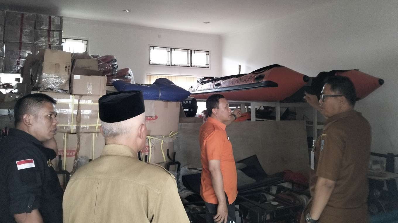 Sekda Sarolangun Muhammad Arief didampingi Kalaksa BPBD Sarolangun Solahuddin Nopri mengecek peralatan dan sarpras penanggulangan bencana