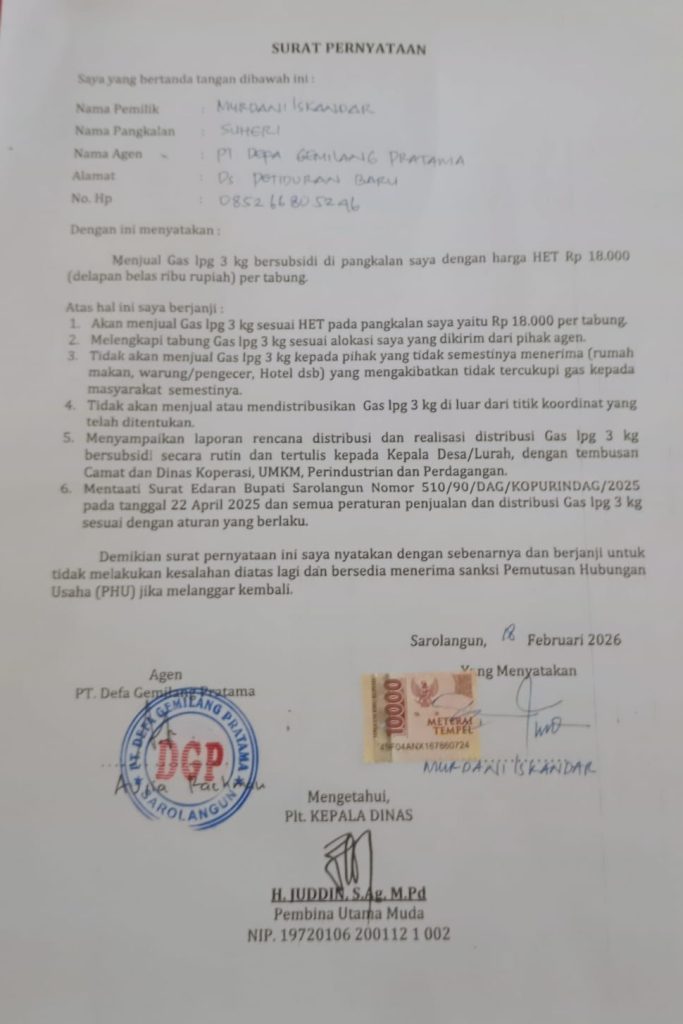 Ada 6 poin dalam Surat pernyataan itu, setiap pangkalan menjual Gas LPG Subsidi 3 kg di pangkalan dengan harga HET Rp 18.000 per tabung.